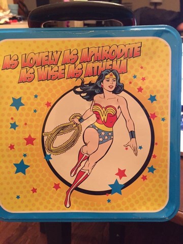 But this lunchbox has a picture of Wonder Woman’s face on one side, and on the other a full-body picture of her flying while extolling her beauty and wisdom. Two very non-violent qualities. What’s more, she’s holding her Lasso of Truth, which she never uses as a weapon.