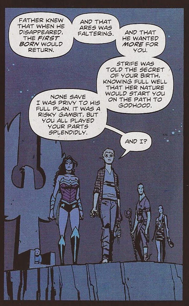 In the end, Athena godsplains Zeus to Diana: “Father… wanted more for you. Strife was told the secret of your birth… [and that started] you on the path to godhood…. You all played your parts splendidly.” In other words, Diana’s father is not only responsible for her powers, and for the relationships and conflicts that have filled her story. He has also planned out her life (without checking with her, of course), and has turned her into the women, goddess, and hero she is today. Diana seems content. This is the Paternal Narrative, supersized.