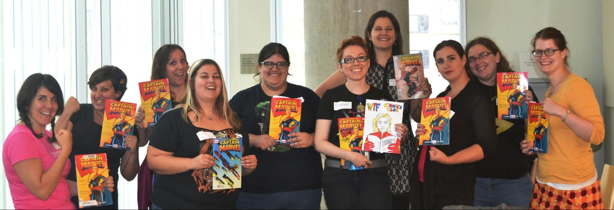 In the spirit of ladies making great comics about ladies, my co-captain and I decided to launch our adventure with the first volume of Kelly Sue DeConnick’s Captain Marvel. So we made a Facebook group and a Twitter account and a Tumblr page, and the next thing we knew, Kelly Sue DeConnick was reblogging our announcement. Between that, word of mouth, and friends dragging in friends, we assembled for our first meeting, pictured above.