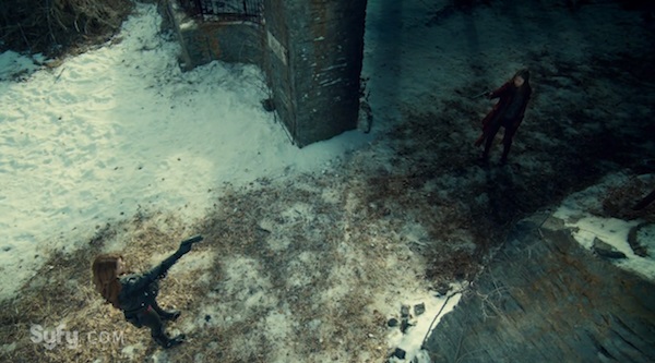 Chrissy proves little match for Willa and Wynonna when she passes out almost immediately when they arrive at the station. Willa starts un-taping Waverly, but things get extra sticky when Waverly realizes Willa is only out for Peacemaker. Willa tries to act as if Waverly is poisoned, but Wynonna sees through her BS pretty quick and it’s Earp vs Earps. Things get a lot more complicated when Nicole walks in, and is greeted by a gun aimed at her chest. Willa calls her a “ginger butch cop” which, rude, but also amazing. Willa outs Waverly and Nicole’s relationship, but it does little to phase Wynonna. She probably already mailed in her PFLAG membership forms last week. When Willa threatens to shoot Nicole if Wynonna doesn’t hand over Peacemaker, Waverly confesses to being in love with Nicole, and Wynonna makes the trade. Willa doesn’t play fair though, and in order to stop her sisters from following her, she shoots Nicole right in the chest with enough force to toss Officer Cinnamon Dimples into the wall.