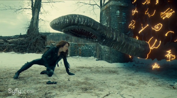 Willa fires Peacemaker, but it does nothing but sputter and click. Willa’s heart is full of hate, and Peacemaker rejects her. Just then, Dolls shows up and wounds Willa with a shot. The evil lurking beneath the ground reveals itself to be a monstrous snake, which wraps itself around Willa and drags her away. In an act of mercy, Wynonna uses Peacemaker to put her sister out of her misery. It’s the hardest thing she has ever had to do. There’s not much of a chance to grieve as the snake comes after Wynonna, who has to do some super-sliding to escape its reach and close the Triangle once again.