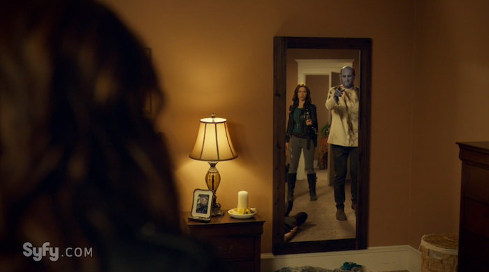 Time is ticking away, so Dolls prepares a ritual he hopes will help Wynonna. It involves an obsidian mirror, sexy candles, and some Latin (read by Waverly). Almost instantly, Dolls is possessed. It takes a taser jolt to snap him out of it, some CPR to revive him, and the damn ritual doesn’t even work.