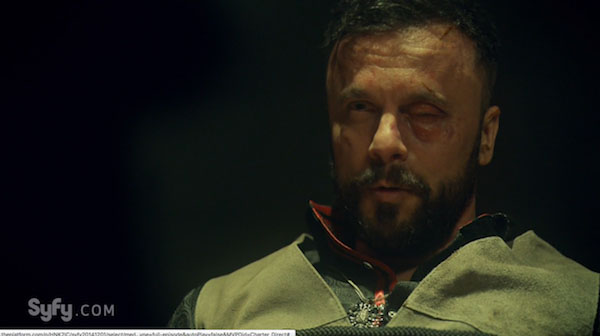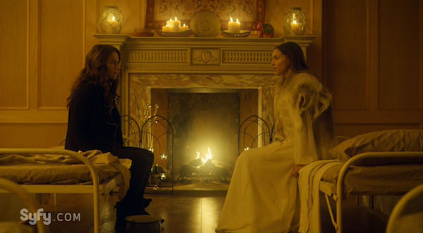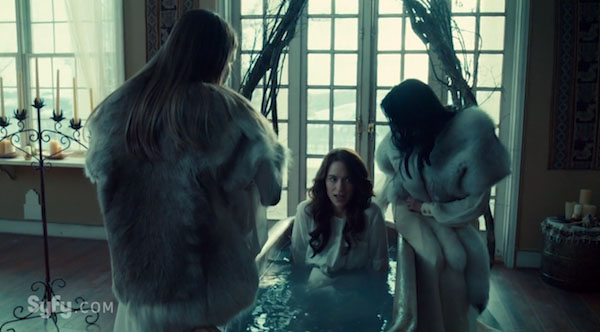 Did you know that Dolls was afraid of the woods? Because he is. They head out into the Pine Barrens and quickly get disoriented and separated. Wynonna follows a bright light and ends up in a strange compound surrounded by young women dressed in white. The leader of this band of ladies is a man they call, Yiska. Wynonna plays along, pretending to be a lost soul looking for meaning. (Melanie Scrofano is particularly hilarious in this scene, nailing one-liners and trying very hard not to freak out in the ritual bath.)