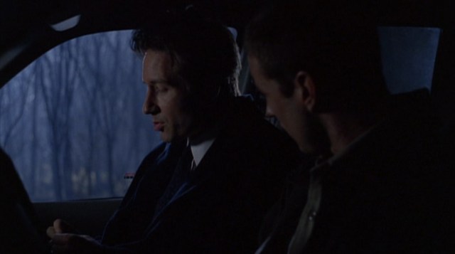 I love great mytharc episodes, and this was one. It’s kind of astonishing to see how quickly Mulder’s turned to the Light Side, but it does make sense given everything they’ve discovered this season. His reaction seems arbitrary in one sense but it is in keeping with his tendency to immediately jump to one conclusion and slave away at it. I’m more intrigued, however, at how all of this will affect Scully. It is profoundly strange to see her warily suggest aliens might be afoot when he’s blaming it all on shady government forces. Gillian does a wonderful job here of conveying how torn Scully is. It’s so completely unlike her to forego the scientific explanation but it’s clear that something’s eating her up inside. This is also the Scully who has difficulty accepting her own vulnerability and, indeed, showing any, so the way she almost forces herself to disagree with Mulder is painful to watch.