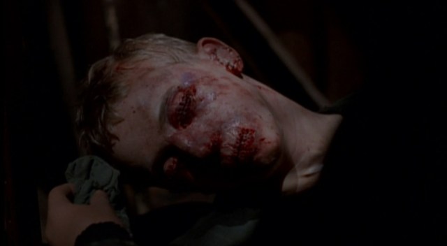 In Tunguska (heyyy old friend), Krycek’s beaten some info out of the poor teenager he captured. He does not disclose this info to his comrades. Instead, the teenager is subjected to the black goo test last seen being used on Mulder. When the test is done, Krycek takes the boy and a vial of mysterious liquid and jumps aboard a ship bound for the US. He’s sewn the boy’s eyes and lips shut (either that or the test caused it). This is, incidentally, exactly what the aliens who burned up the Kazakh village looked like.