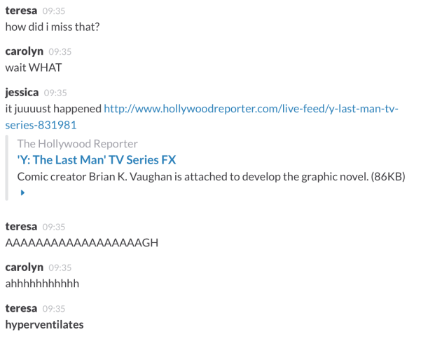 FX is currently working on a TV show based on Y: The Last Man, the hit graphic novel by writer Brian K. Vaughan. He’ll be joining up with Nina Jacobson and Brad Simpson of Color Force, a studio famous for creating movies out of novels (The Hunger Games, for example). They’re also searching for one more writer to help Vaughan flesh out the story into a TV show.