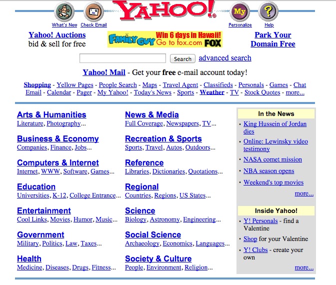For you youngsters, before the Internet became a vast, wide place where you had to wade through piles of stuff no one cares about to find what you want, it was a much smaller place where you had to wade through piles of stuff no one cares about to find what you want. YAHOO! was the answer to that problem, because search engines back then were worse than the little Windows search dog.