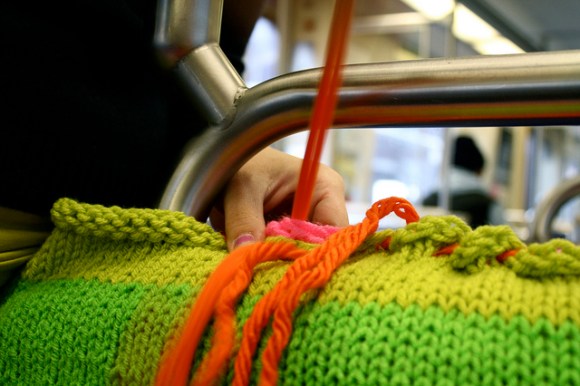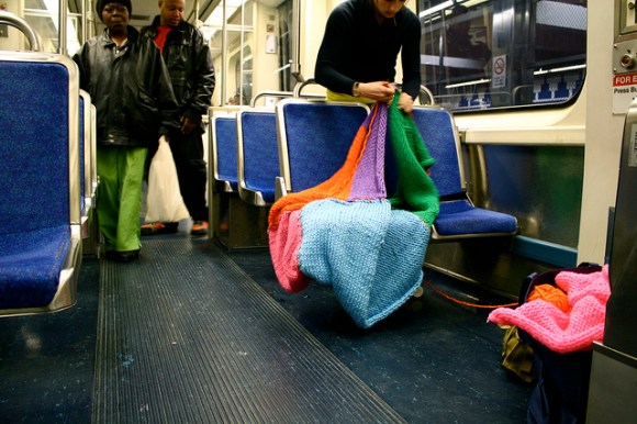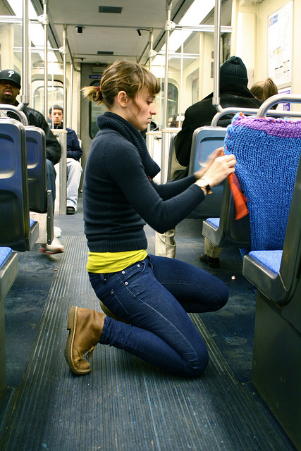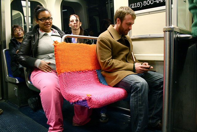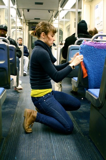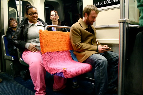 Crafty and cozy street artist Ishknits has struck again, this time on Philadelphia’s Blue Line Train. Blast that Ishknits! Destroying the mundanity of mass transit with snuggly sweaters, preventing weary riders from sliding to-and-fro! More pics of this latest project after the jump.