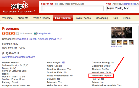 Crowdsourced restaurant review site Yelp has just given users yet another data point on which to base their dining decisions: In addition to options like ‘romantic,’ ‘dressy,’ ‘casual,’ and ‘touristy,’ the “ambience” portion of a bar or eatery’s description can now simply say ‘hipster.’ Yes, hipster is an ambience now, apparently. You can see examples of it here and here.