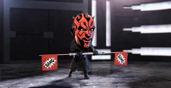 It’s been a while since we’ve seen a Brisk commercial in that Celebrity Death Match-style and frankly, we weren’t really missing it but it works great in this particular situation. (Even if it’s really a commercial for Star Wars Episode I: The Phantom Menace 3D) It’s Darth Maul vs. Yoda for the first time! Too bad Darth Maul had a super-late night being bad.