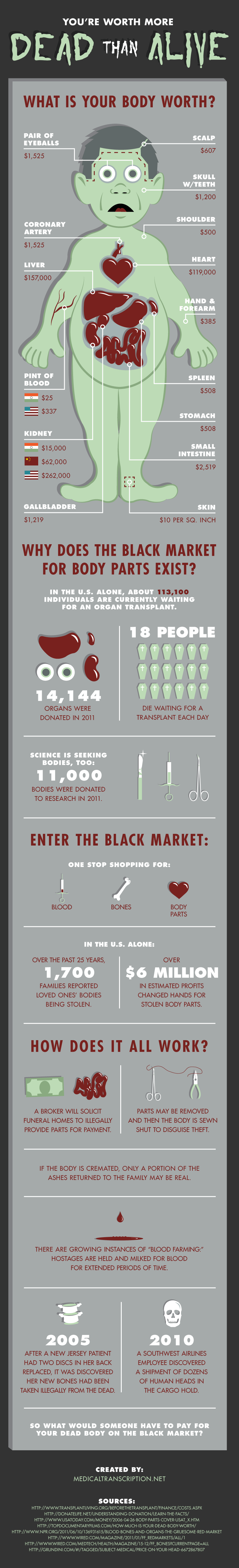 When applying to jobs, you’ll generally give a quote of what you think your services are worth. However, when you’re all used up from a lifetime of that job, someone else may pay good money for you. Not your services, mind you, but the less used up parts of your body. You know, like your liver or coronary artery. The black market is something you probably don’t want to ever become involved with, but now if you do and also happen to read this infographic provided by Medical Transcription, you’ll know around how much your shoulder is worth.
