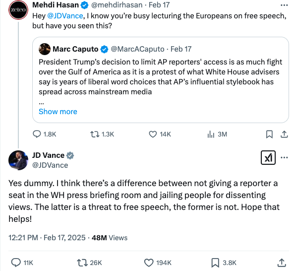 When challenged about his administration’s own attacks on press freedom, Vance responded with characteristic condescension. “Yes dummy,” he tweeted at journalist Mehdi Hasan. “I think there’s a difference between not giving a reporter a seat in the WH press briefing room and jailing people for dissenting views.”