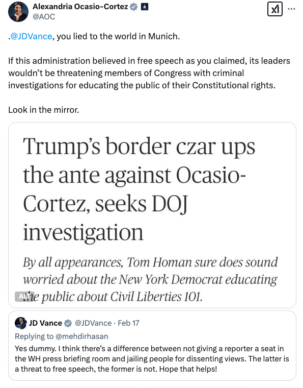 This administration’s hypocrisy runs deep. While Vance preaches about European overreach, his government has barred Associated Press reporters from Air Force One for refusing to rename the Gulf of Mexico the “Gulf of America.” Meanwhile, Trump’s border czar Tom Homan has threatened Rep. Alexandria Ocasio-Cortez with criminal investigation for educating constituents about their constitutional rights, asking ominously on Fox News, “Is she crossing the line? So, I’m working with the Department of Justice and finding out.”