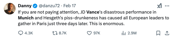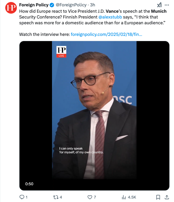 Rather than address urgent matters like Ukraine’s defense needs or NATO strategy, Vance chose to place America’s allies on coals while cozying up to far-right figures like Germany’s Alice Weidel. As one U.S. commentator noted to the BBC, “That was all for U.S. domestic consumption.” In other words, it was a dog-and-pony show for Trump’s base to project some semblance of strength abroad.