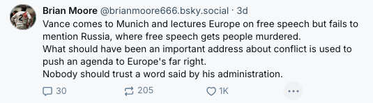 Nathalie Tocci, director of Istituto Affari Internazionali think tank, cut to the black heart of Vance’s bad faith agenda: “Vance’s attack on European democracy in Munich, perversely twisting the language of democracy itself should leave no doubt whatsoever that the aim of this administration is to destroy the EU and its liberal democracies.”
