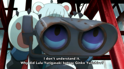 “We thought you were a bear,” they say, to which Lulu oh-so-smoothly replies “HAHA YOU CRAZY HEY LOOK A DISTRACTION GROWL” and asks them about the Ominous Military Vehicle at the school. Turns out it’s a Bear-Killing Beam Truck powered by none other than Zombie Cyborg Yurikawa Konomi. Yes, really.
