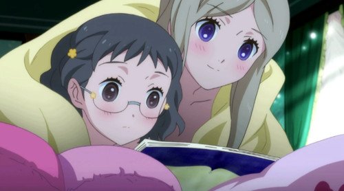 5-Minute Mark Theory Time! So I reckon we can put aside the idea that these two are in a Class S “romance” or even just the early stages of a physical relationship. They’re pretty clearly naked under those covers, and this whole scene feels very tender and post-coital. I appreciate how Yurikuma has teased this out over half a season and then presents it in such a nonchalant fashion (it almost gets lost in the ensuing Storytime, which we’ll get to in a sec), as if to say, “What, you didn’t know this all along?”