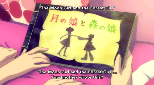 As for that picture book, it’s Reia’s unpublished story, The Moon Girl and the Forest Girl, which looks absolutely gorgeous and goes a little something like this: “Once upon a time” (I believe I established two episodes ago that we all have to do a shot now, so if you’ll excuse me…), there was a moon world and a forest world, separated by the sky. One day girls from the two worlds came into contact when a moon girl (human-ish) dropped her star pendant and a forest girl (bear-ish) found it. The two became fascinated with the other’s world and prayed to the goddess Kumalia to allow them to cross the distance—one so she could find the pendant, and the other so she could return it.