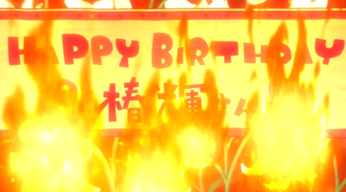 As night falls, Kureha finds the flowerbed decorated for her birthday party. The rest of the class does that creepy thing they do where they all pop out at once (invisible girls, man), each one carrying a candle. You know. To put on the giant birthday… cake.