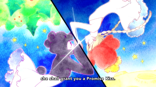 The girls take Kumalia’s ladder to the center of the sky, where a mirrored wall stands between them. Kumalia tells them that they have to “smash the ‘you’ in the mirror to bits” in order to receive the Promise Kiss from the other, although it may cost them their lives to do so. The girls stare at their own reflections, and then… The story ends because Kureha’s mom died before she could finish it?!
