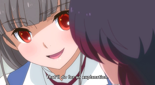 20-Minute Mark Theory Time! As is often the case at this point, my brain is beginning to sputter, but I’m considering the way the Invisible Girls are changing—in how they included Kureha, demonstrated decisive action against an actual attacker… heck, even the way the infirmary girls were being affectionate in a semi-open manner (I think I’m officially subscribing to the idea that everyone at this school is a lesbian and “evil” girls were those who were public about it, the way Kureha and Sumika were).